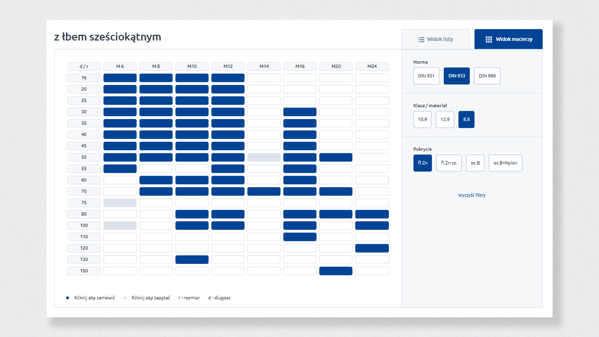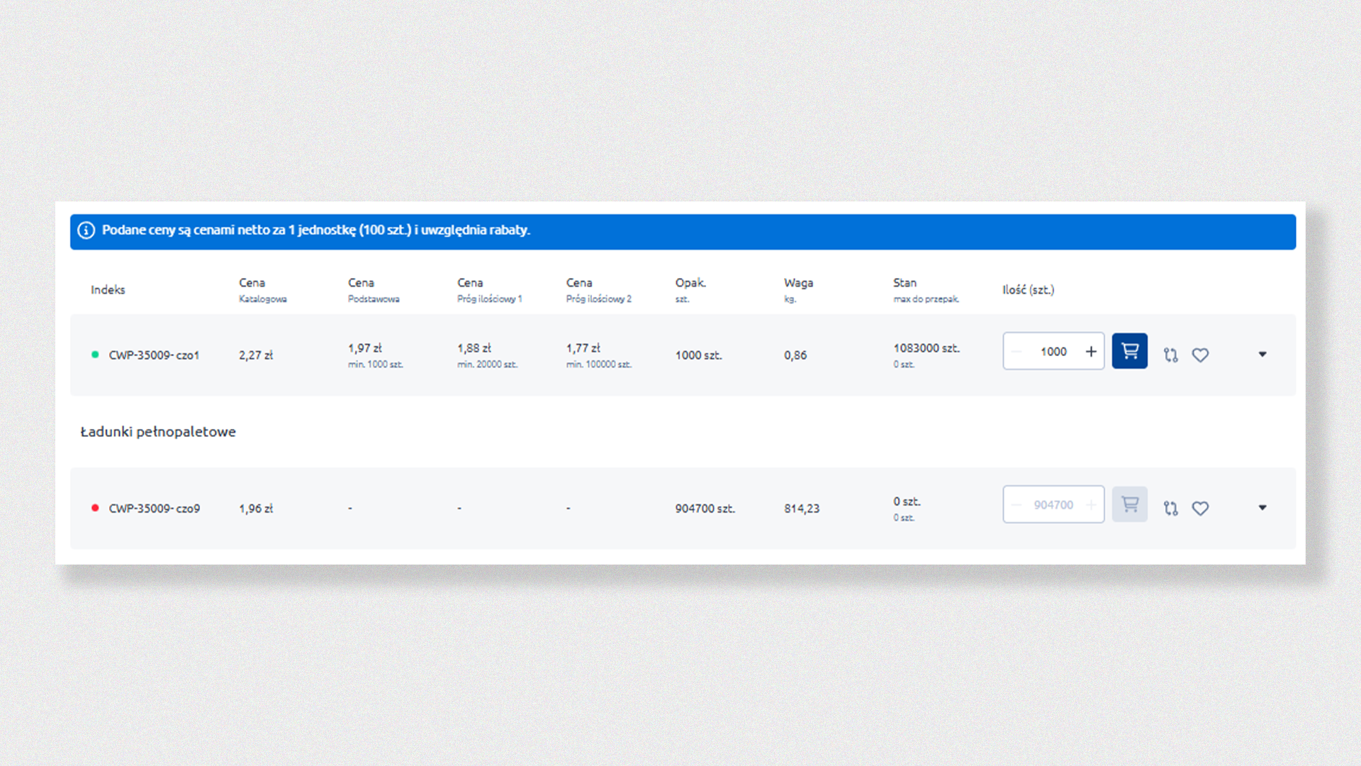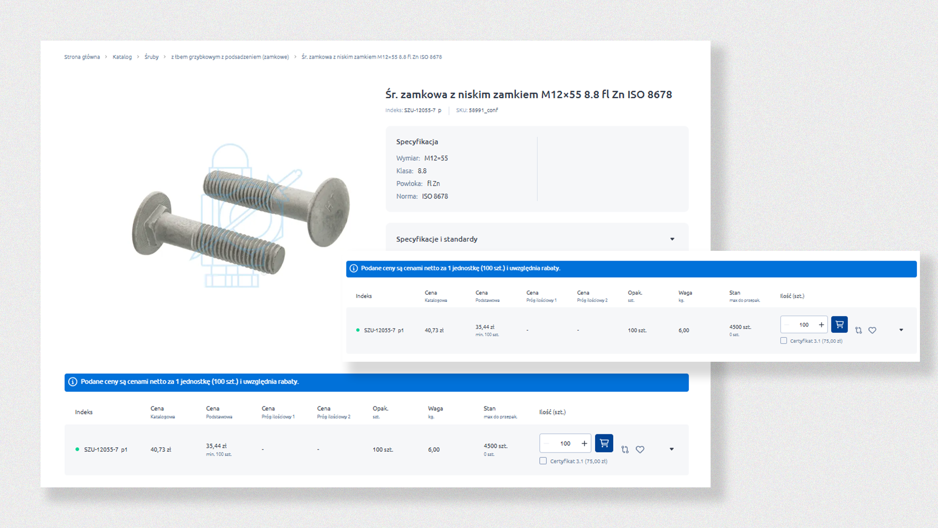 The structure of the product listing is based on the logic: base product + packaging variants. Additionally, the price is always recalculated per 100 pieces, and the minimum purchase unit is a multiple of packages (25, 50, 250, etc.) – with the option to add only that minimum number of products to the cart.