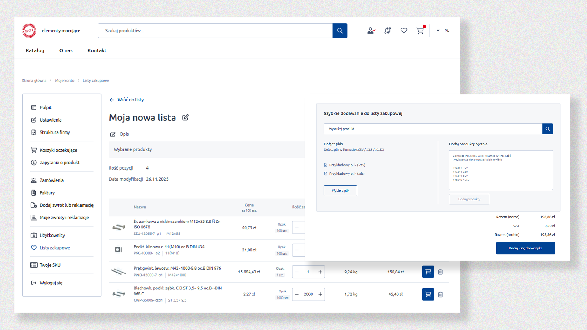 The store also supports planning and repeatability of orders. Users can create shopping lists, save carts and reuse ready-made sets of items multiple times (so-called multi-carts). This feature significantly speeds up cyclical purchases, typical for the B2B model.